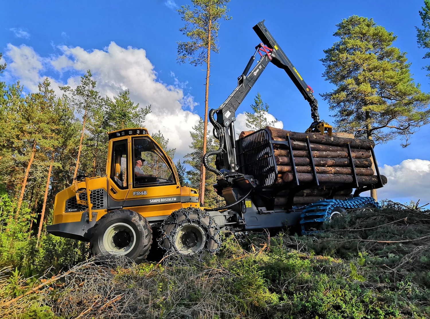 FR28-skotaren är en specialmaskin för gallring och mjuka avverkningsförhållanden. Med en lastkapacitet på 10 ton är den väl anpassad för att samarbeta med skördaren SAMPO-ROSENLEW HR46x. Dess låga vikt, stora styrvinkel och många andra egenskaper gör den till ett tekniskt och ekonomiskt överlägset val för gallring och avverkning på mjuka marker.